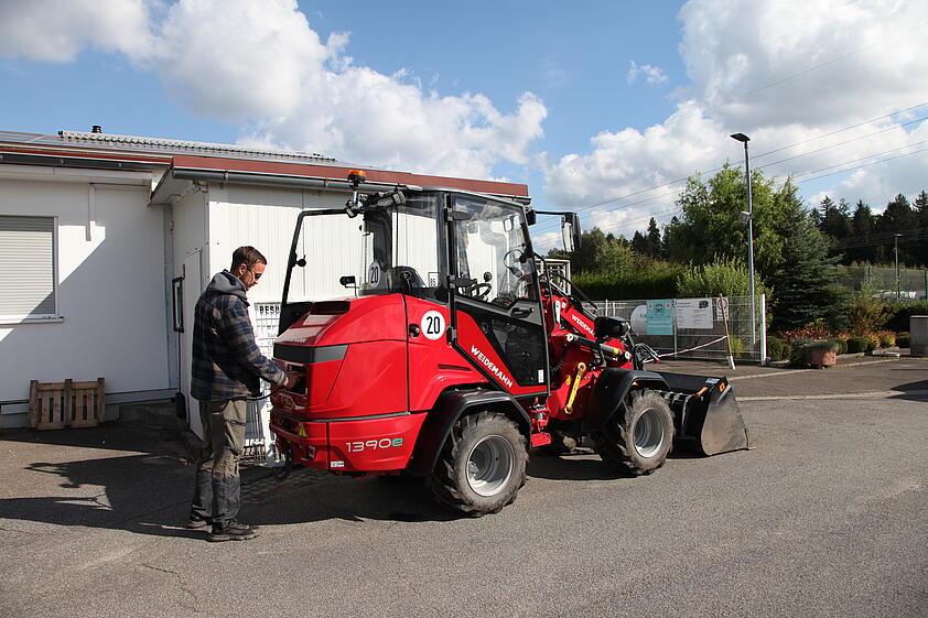 Le Weidemann 1390e est équipé d'une grande batterie de 28 kWh et de deux chargeurs embarqués. La recharge s'effectue principalement via son propre système photovoltaïque (80 kWh) lorsque le soleil brille, complété par de l'électricité verte certifiée. Grâce à des recharges intermédiaires pendant les pauses, la batterie lithium-ion peut également être rechargée partiellement à tout moment. La recharge s'effectue généralement tous les trois jours et la gestion de la recharge est organisée de manière optimale par le conducteur attitré Jerome Nailing, qui surveille en permanence le niveau de charge du 1390e.