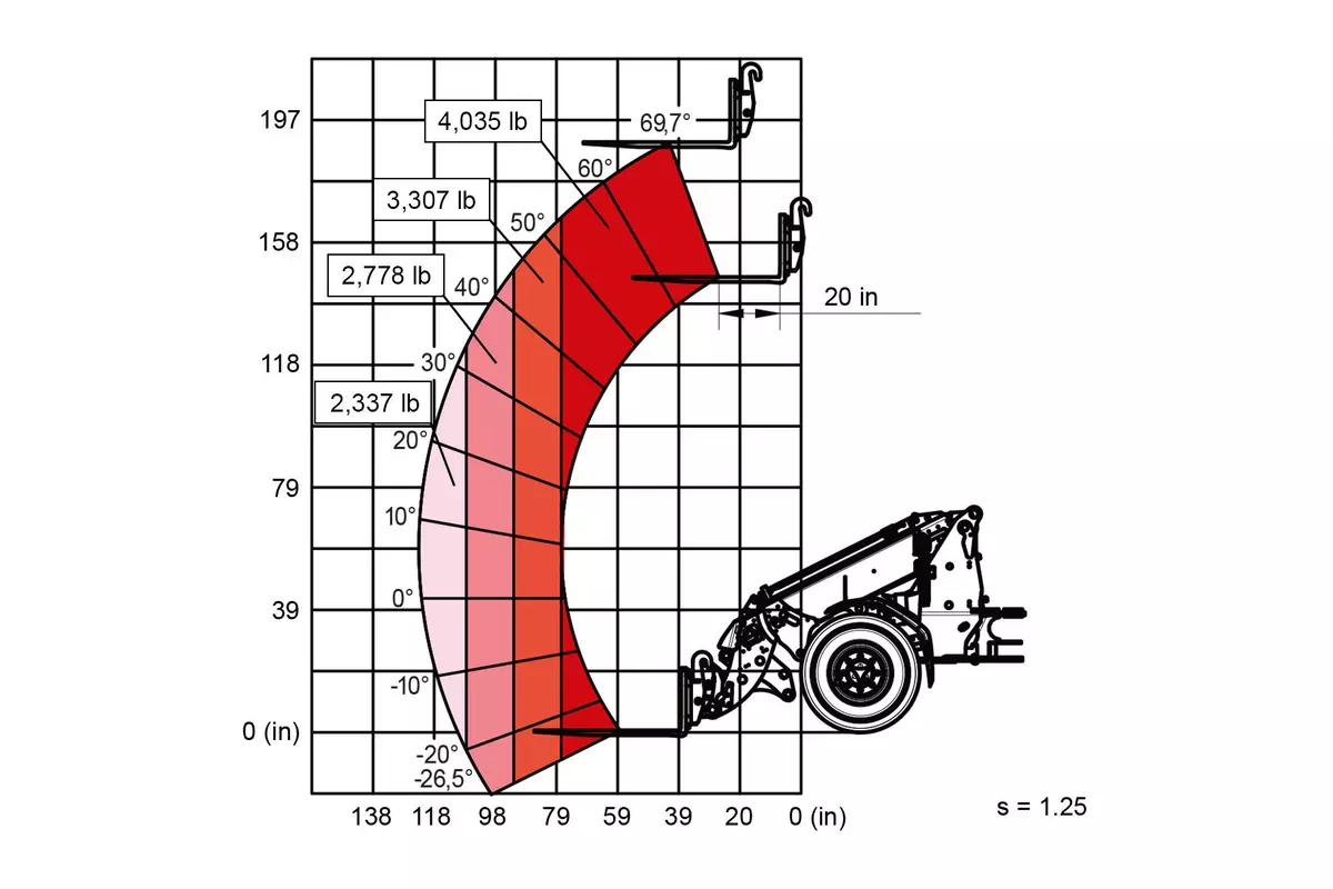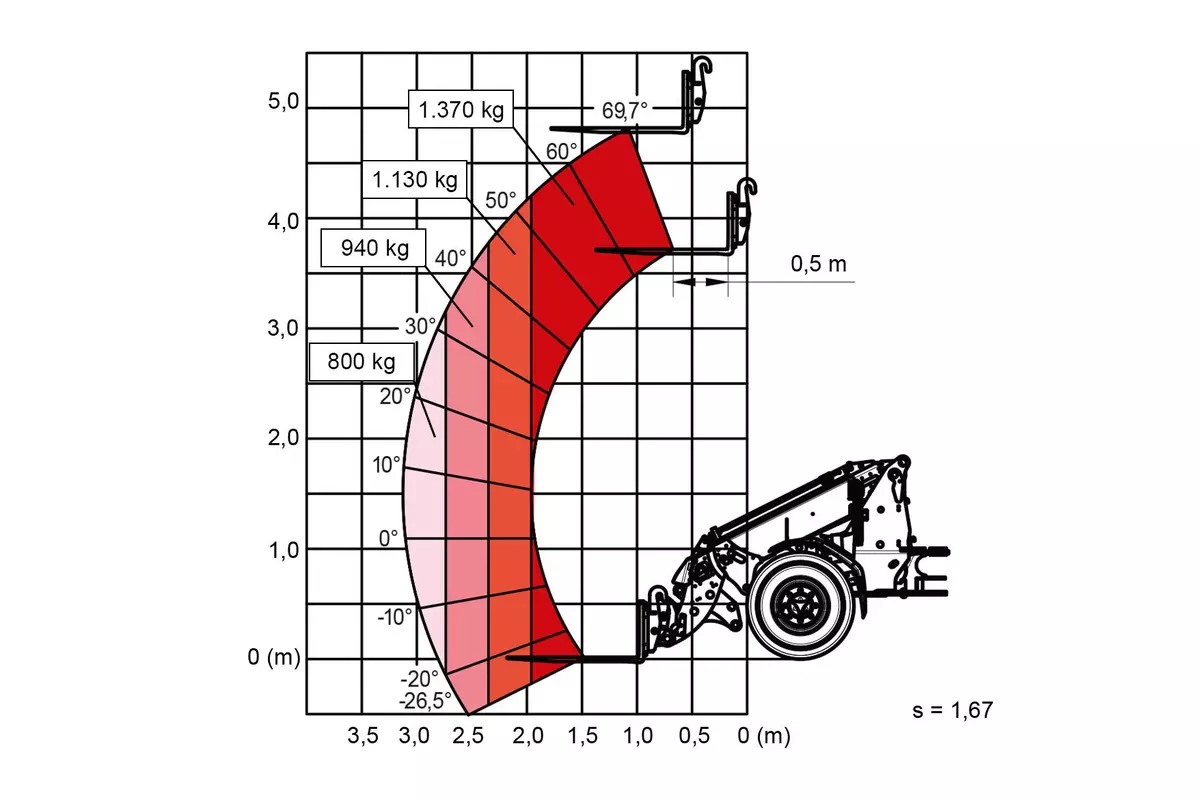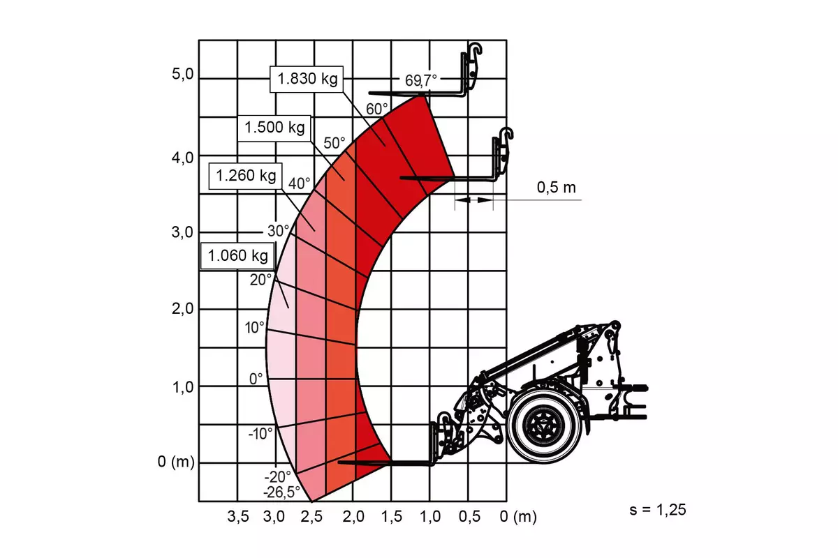 | Charge de basculement avec fourche à palettes – machine braquée (déployée) | 1.330 - 1.500 kg |