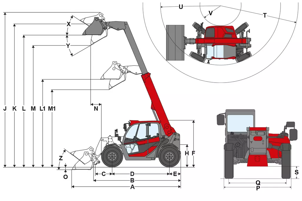 | L1 | Wysokość załadunku wsuniętego ramienia teleskopowego | 4.470 mm 175,98 in | ||||